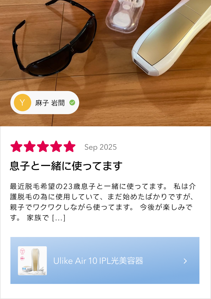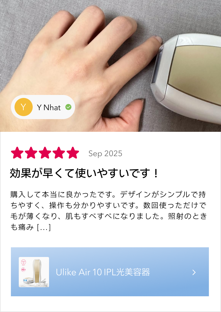 ご安心ください。 UlikeのIPL脱毛技術は、数多くの臨床試験に基づいて開発されています。現在、IPLは医療機関から一般家庭まで、幅広く信頼されている脱毛方法です。