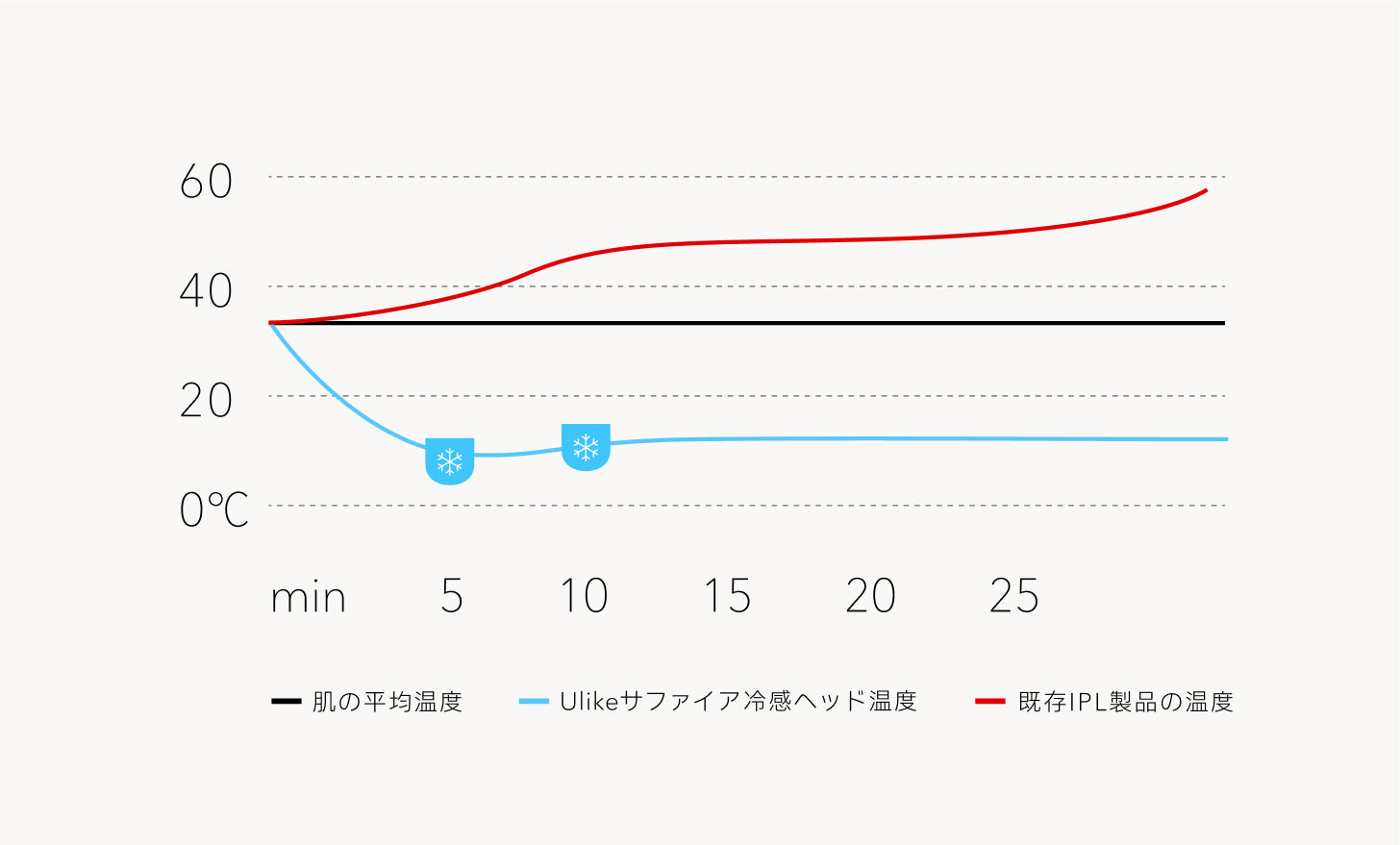 独自の放熱システムを搭載したUlikeの3.0サファイア冷感技術なら、30分間連続で照射しても、肌温度を16度以下*²にキープ。