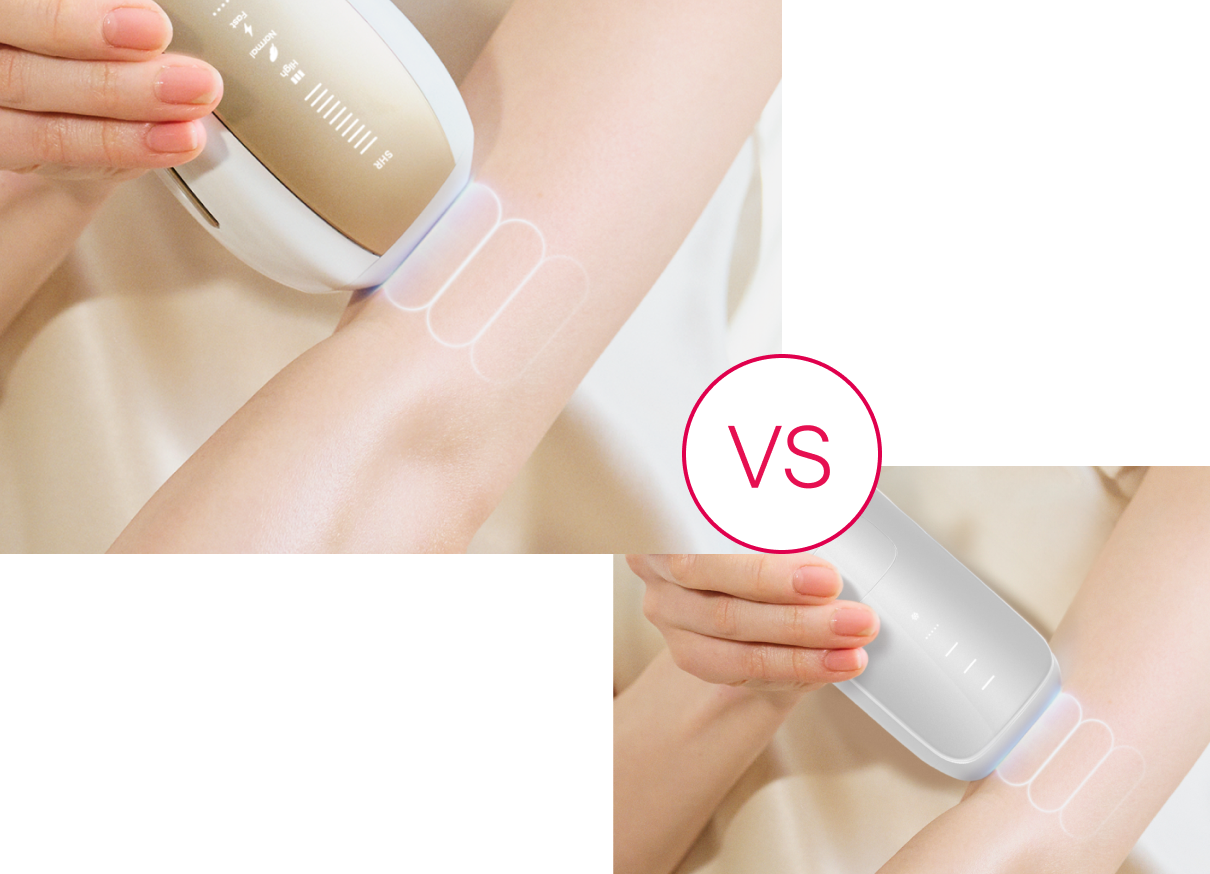 UlikeのSHRモード*は、一回の照射で、4回連続フラッシュ1できます。ダブルランプから高速なパルス光を交互に照射し、エネルギーを蓄積して、