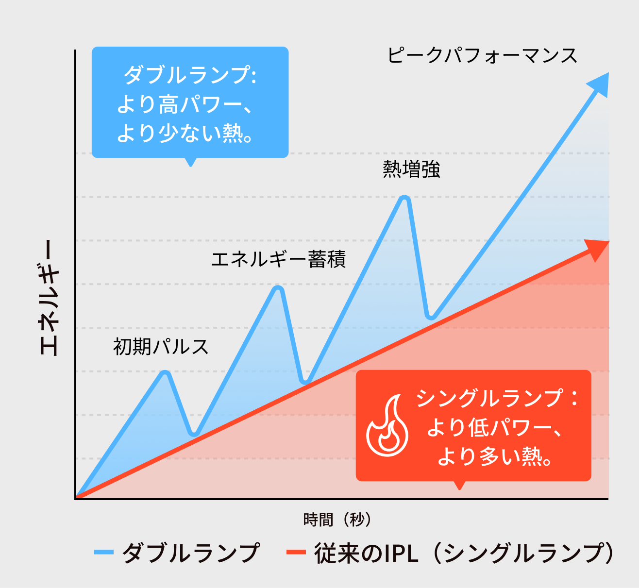 - エネルギーレベルの制限: シングルランプは、高いエネルギーを出力しようとすると肌を傷つけるリスクが高まるため、安全性を考慮してパワーを制限せざるを得ません。そのため、効果的な高エネルギーを安全に届けることができないという限界があります。